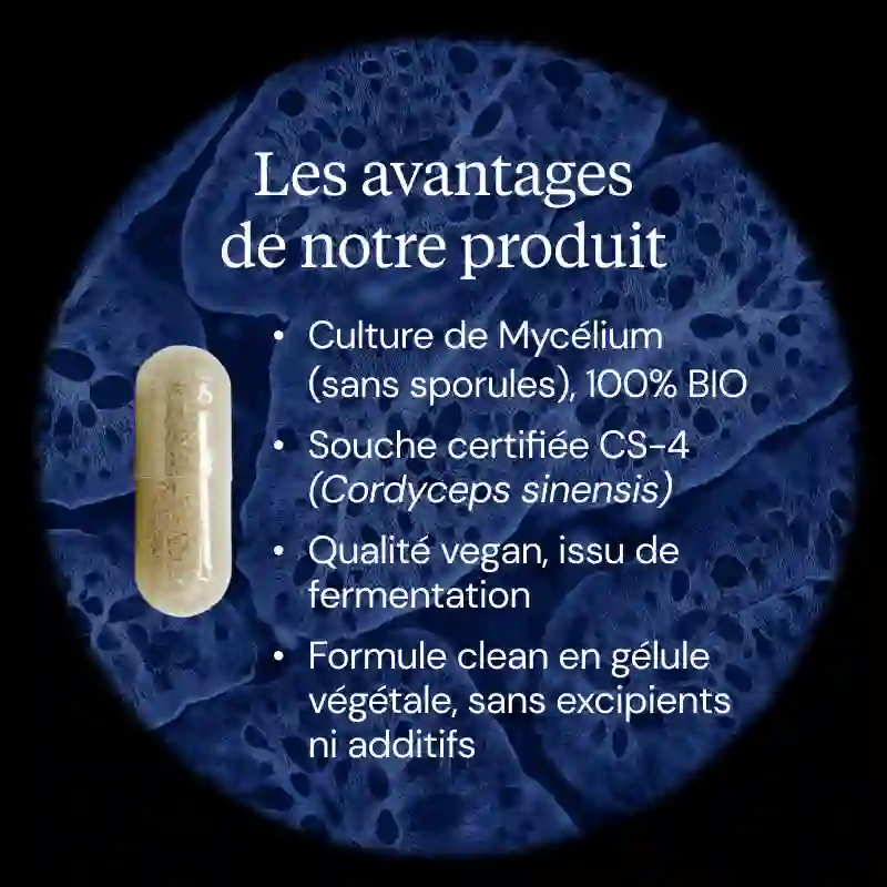 - Cordyceps 100% BIO, titré à 60% de polysaccharides actifs, dont 20% bêta-glucanes
