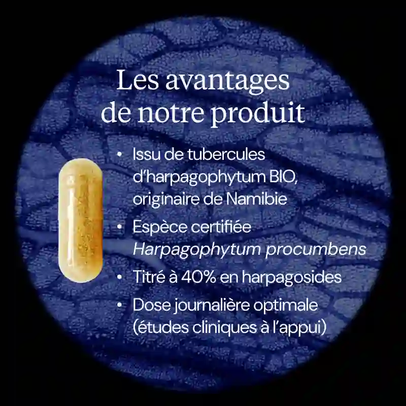 - Extrait BIO titré à 40 % en harpagosides = 80 mg d'actifs par gélule