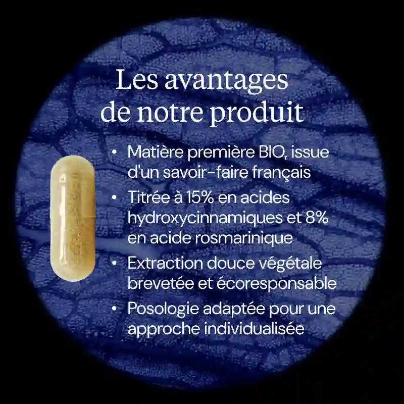 - Titrée 15% acides hydroxycinnamiques, 8% acide rosmarinique