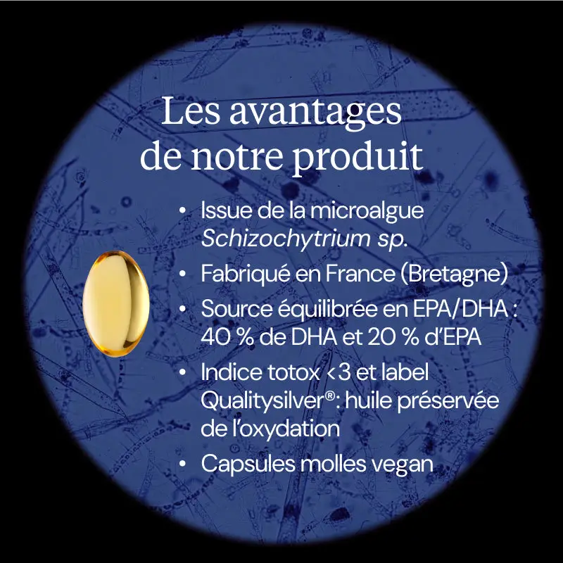 - Source microalgues Vegan cultivées en fermenteur à l'abri des pollutions